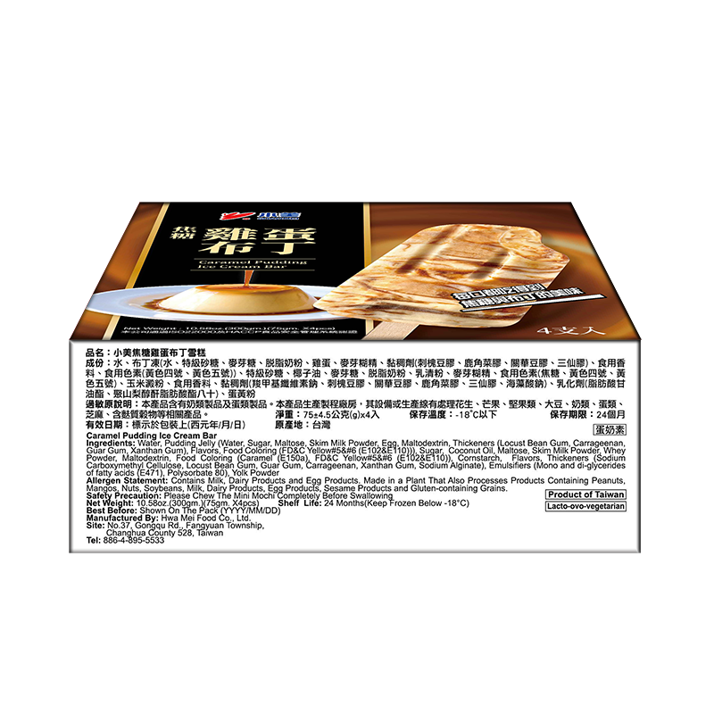 Ingredients: Water, Pudding Jelly (Water, Sugar, Maltose, Skim Milk Powder, Egg, Maltodextrin, Thickeners (Locust Bean Gum, Carrageenan, Guar Gum, Xanthan Gum), Flavors, Food Coloring (FD&C Yellow#5 (E102&E110))), Sugar, Coconut Oil, Maltose, Skim Milk Powder, Whey Powder, Maltodextrin, Food Coloring (Caramel (E150a), FD&C Yellow#5 (E102&E110)), Cornstarch, Flavors, Thickeners (Sodium Carboxymethyl Cellulose, Locust Bean Gum, Guar Gum, Carrageenan, Xanthan Gum, Sodium Alginate), Emulsifiers (Mono and di-glycerides of fatty acids (E471), Polysorbate 80), Yolk Powder