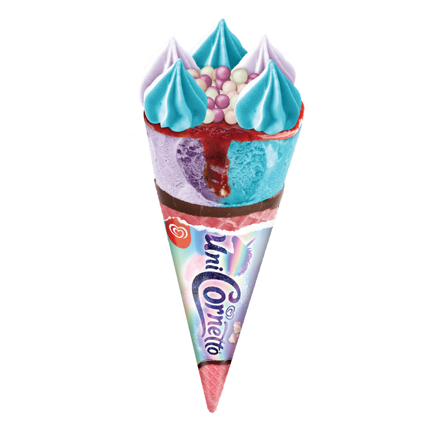 Marshmallow and Cotton Candy Flavoured Ice Confection with Strawberry Flavoured Syrup and Topped with Coloured Chocolate Coated Cereals Crunch.