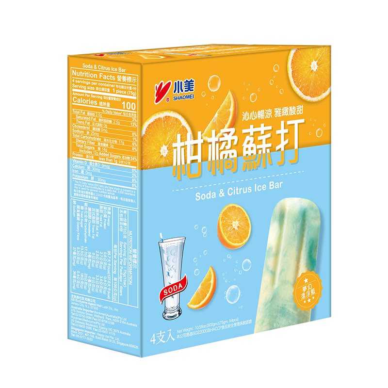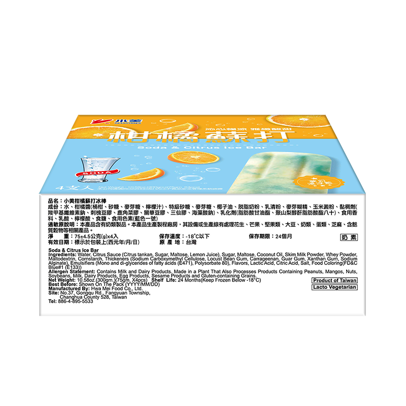 Ingredients: Water, Citrus Sauce (Citrus tankan, Sugar, Maltose, Lemon Juice), Sugar, Maltose, Coconut oil, Skim Milk powder, Whey Powder, Maltodextrin, Cornstarch, Thickeners(Sodium Carboxymethyl Cellulose, Locust Bean Gum, Xanthan Gum, Carrageenan,Guar Gum, Sodium Alginate), Emulsifiers (Mono and di-glycerides of fatty acids(E471), Polysorbate 80), Flavors, Lactic Acid, Citric Acid, Salt, Food Coloring (FD&C Blue#1(E133))